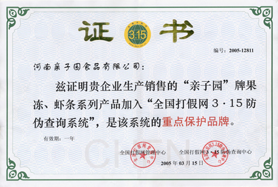 在全國打假網(wǎng)“重點(diǎn)保護(hù)產(chǎn)品(單位)”活動(dòng)中被授予2005年“重點(diǎn)保護(hù)產(chǎn)品(單位)”稱號(hào)。